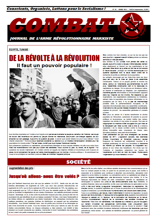 Combat 19 Numéro 19 – Mars 2011 Édito : Égypte, Tunisie : De la révolte à la révolution Augmentation des prix : Jusqu’où allons-nous être volés ? Projet de réforme fiscale Le peuple et l’impôt Libye : Un soulèvement qui ne sert que l’impérialisme Les syndicats ouvriers et la révolution Read more articles Article précédentCombat 18 Article suivantCombat 20 Vous devriez également aimer Combat 24 20 avril 2019 Combat 6 30 mars 2019 Combat 35 1 mai 2019 Publication publiée :13 avril 2019