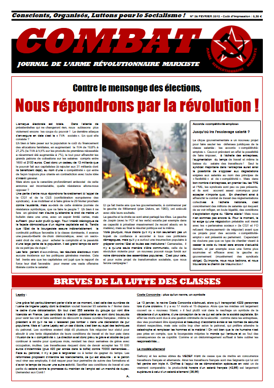 Combat 26 Numéro 26 – Février 2012 Édito : Contre le mensonge des élections, nous répondrons par la révolution ! Accords « compétitivité-emploi » :Jusqu’où ira l’esclavage salarié ? Lejaby Costa Concordia : Plus qu’un navire, un symbole Le modèle allemand Sur l’interdiction des licenciements Comment en finir avec le chômage ? Read more articles Article précédentCombat 25 Article suivantCombat 27 Vous devriez également aimer Combat 28 24 avril 2019 Combat 8 2 avril 2019 Combat 41 7 mai 2019 Publication publiée :22 avril 2019