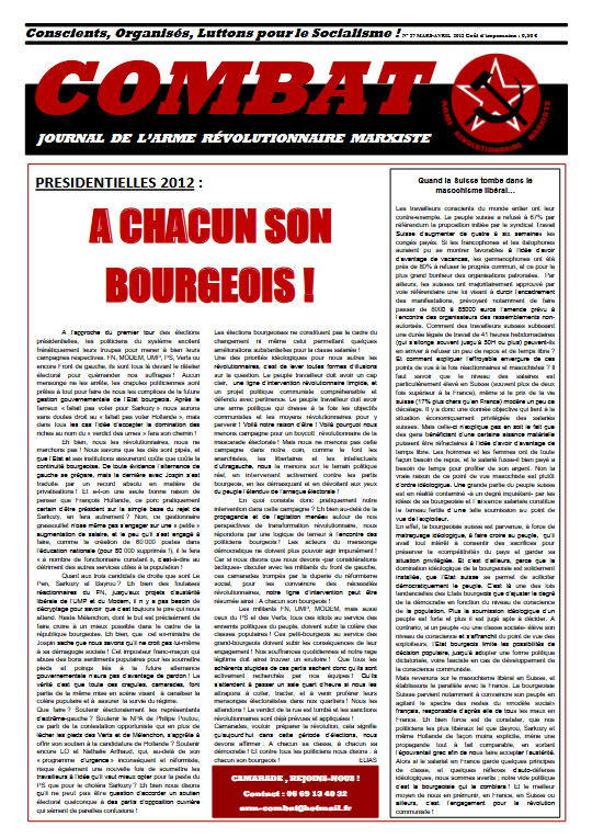 Combat 27 Numéro 27 – Mars/Avril 2012 Édito : Présidentielles 2012 : A chacun son bourgeois ! Un hiver de plus sous le capitalisme Renault Arcelor-Mittal Petroplus PSA Aulnay Quand la Suisse tombe dans le masochisme libéral Élections présidentielles : Les acteurs de la mascarade Le seul projet révolutionnaire : le communisme ! Read more articles Article précédentCombat 26 Article suivantCombat 28 Vous devriez également aimer Combat 20 15 avril 2019 Combat 36 2 mai 2019 Combat 47 20 novembre 2021 Publication publiée :23 avril 2019