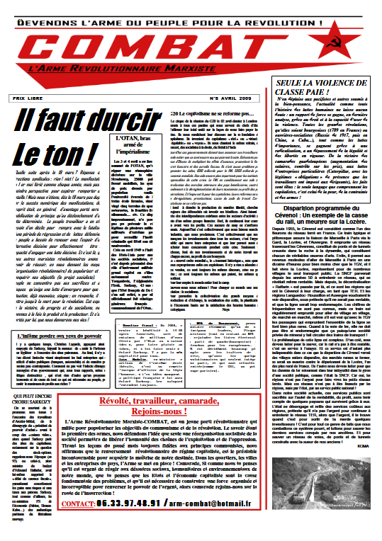 Combat 8 Numéro 8 – Avril 2009 Édito : Il faut durcir le ton ! Seule la violence de classe paie ! L’OTAN, bras armé de l’impérialisme Corée du Nord Élections en Moldavie : La réaction éclate… Les contraventions, un racket d’État Procès des Khmers rouges : Hypocrisie impérialiste ! Comprendre la vraie nature de l’État Read more articles Article précédentCombat 7 Article suivantCombat 9 Vous devriez également aimer Combat 2 26 mars 2019 Combat 36 2 mai 2019 Combat 28 24 avril 2019 Publication publiée :2 avril 2019