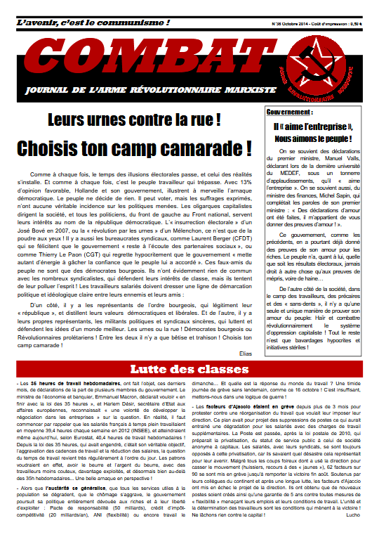 Combat 36 Numéro 36 – Octobre 2014 Édito : Leurs urnes contre la rue ! Choisis ton camp camarade ! Victoire pour les facteurs d’Ajaccio ! Gouvernement : Il « aime l’entreprise », nous aimons le peuple ! Les SCOP, une solution en carton ! Read more articles Article précédentCombat 35 Article suivantCombat 37 Vous devriez également aimer Combat 12 6 avril 2019 Combat 4 28 mars 2019 Combat 31 27 avril 2019 Publication publiée :2 mai 2019