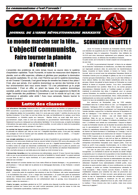 Combat 37 Numéro 37 – Novembre 2014 Édito : Le monde marche sur la tête… L’objectif communiste, faire tourner la planète à l’endroit ! Schneider en lutte ! Autoroutes : Les parasites du capitalisme ! Burkina Faso : Soulèvement populaire et après ? L’armée ? Comment en finir définitivement avec le chômage ? Read more articles Article précédentCombat 36 Article suivantCombat 38 Vous devriez également aimer Combat 15 9 avril 2019 Combat 25 21 avril 2019 Combat 28 24 avril 2019 Publication publiée :3 mai 2019