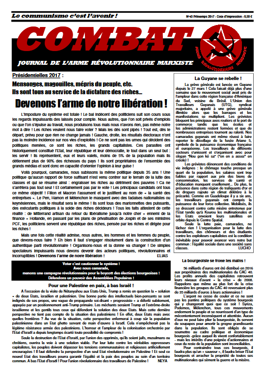 Combat 43 Numéro 43 – Printemps 2017 Édito : Présidentielles 2017 : Devenons l’arme de notre libération ! La bourgeoisie se frotte les mains La Guyane se rebelle ! Pour une Palestine en paix, à bas Israël ! Leur démocratie et la nôtre Read more articles Article précédentCombat 42 Article suivantCombat 44 Vous devriez également aimer Combat 21 16 avril 2019 Combat 6 30 mars 2019 Combat 39 5 mai 2019 Publication publiée :9 mai 2019