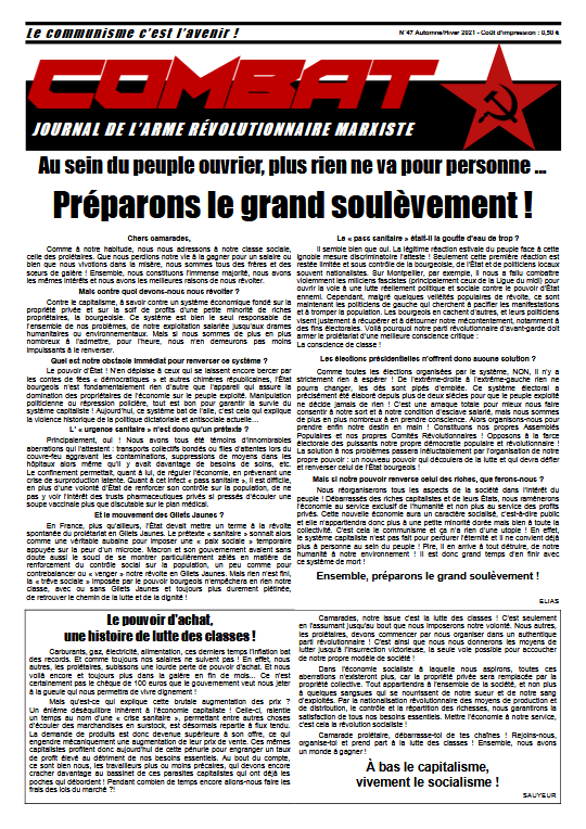 Combat 47 Numéro 47 – Automne / Hiver 2021 Édito : Préparons le grand soulèvement Le pouvoir d’achat, une histoire de lutte des classes ! Liban : Contre l’oppression, c’est l’État bourgeois qu’il faut exploser ! Où est passé le mouvement ouvrier ? Read more articles Article précédentÉlections européennes : Boycott révolutionnaire ! Vous devriez également aimer Combat 48 23 avril 2023 Combat 2 26 mars 2019 Combat 15 9 avril 2019 Publication publiée :20 novembre 2021